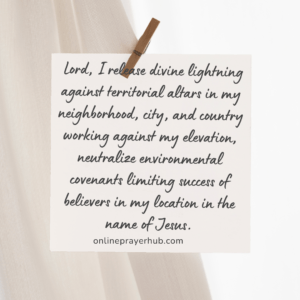 8. Lord, I release divine lightning against territorial altars in my neighborhood, city, and country working against my elevation; neutralize environmental covenants limiting success of believers in my location in the name of Jesus.
