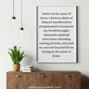 13. Father in the name of Jesus, I destroy altars of delayed manifestation programmed to postpone my breakthroughs; dismantle spiritual structures extending waiting periods, and push my success beyond divine timing in the name of Jesus.