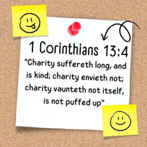 • 1 Corinthians 13:4: “Charity suffereth long, and is kind; charity envieth not; charity vaunteth not itself, is not puffed up”